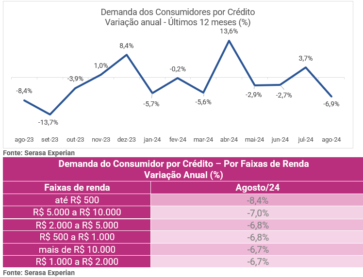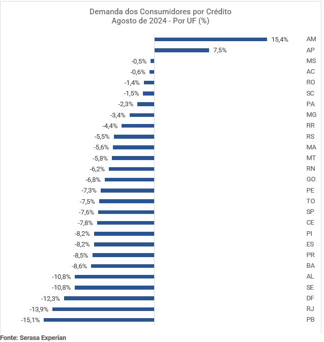 "A taxa Selic elevada torna o crédito mais caro e menos acessível, enquanto a inflação persistente corrói o poder de compra das famílias, forçando-as a priorizar gastos essenciais. Além disso, a incerteza econômica e o aumento do desemprego criam um ambiente de cautela, onde tanto consumidores quanto empresas hesitam em assumir novas dívidas. Esse cenário é agravado pelo alto nível de endividamento já existente, que limita ainda mais a capacidade de buscar novos financiamentos. Em tempos de volatilidade, a estabilidade financeira se torna uma prioridade", avalia o economista da Serasa Experian, Luiz Rabi. Apenas duas Unidades Federativas (UFs) não demonstraram queda Em agosto, apenas os estados do Amazonas (15,4%) e Amapá (7,5%) não demonstraram queda na demanda dos consumidores por crédito. Confira o levantamento completo por Unidade Federativa (UF) no gráfico abaixo: |