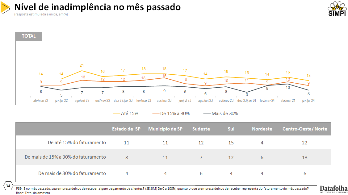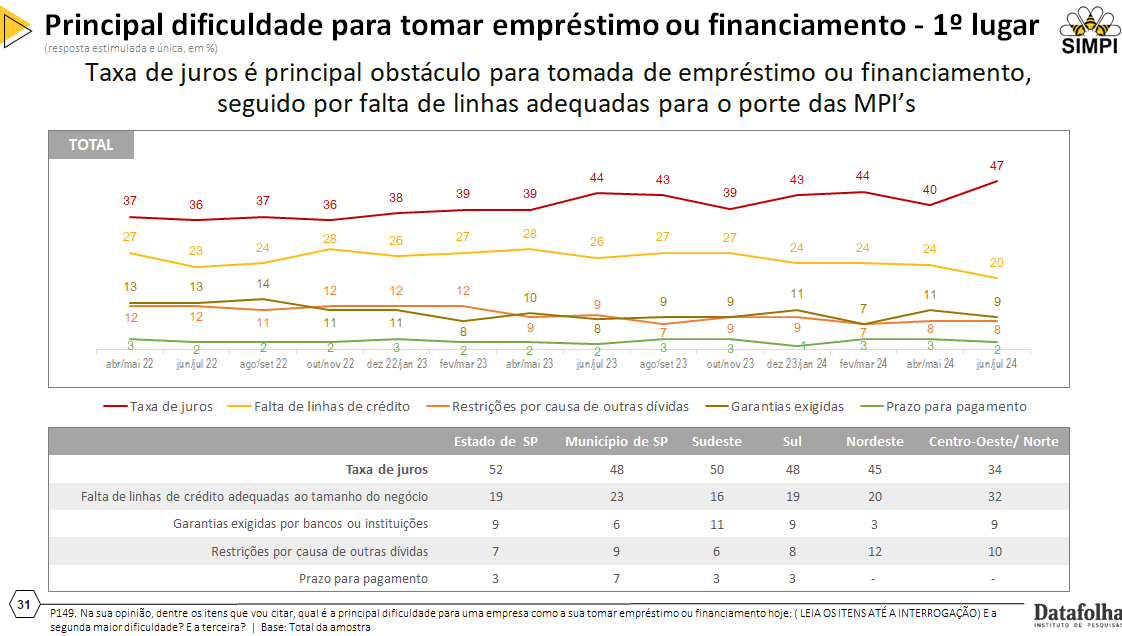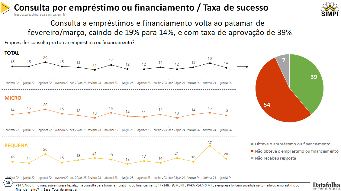 A 14ª Pesquisa Indicador Nacional de Atividade da Micro e Pequena Indústria do SIMPI/Datafolha revela uma visão abrangente do panorama econômico durante o mês de junho/julho. Nesta edição, a pesquisa mostra a relação entre a falta de acesso a capital de giro e empréstimo com o número de Micro e Pequenas Indústrias em atraso no pagamento. O número de consultas a empréstimos e financiamentos voltou a cair e alcançou o mesmo patamar do início do ano, com 14%. O número, ainda que 5 pontos percentuais menor que o do último bimestre deixa clara a dificuldade de aprovação, já que desses 14%, apenas 39% das MPI's tiveram crédito aprovado. |