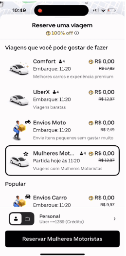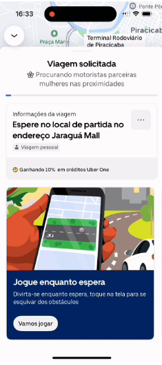 Como isso depende da quantidade de motoristas parceiras na região, se o tempo de espera for muito longo, o aplicativo irá redirecionar o pedido de viagem para o motorista mais próximo de forma automática. Essa modalidade estará disponível em Piracicaba, Uberlândia, Curitiba, Campinas, São José dos Campos, Ribeirão Preto e Campo Grande.     - Mulheres Motoristas: As usuárias verão a opção "Mulheres Motoristas" entre os produtos disponíveis para solicitar uma viagem de forma imediata na tela inicial. Ao selecionar essa opção, o app tentará parear a viagem com uma  motorista mulher. Se o tempo de espera for muito longo, o aplicativo perguntará à usuária se ela deseja continuar aguardando ou se prefere redirecionar a viagem para o motorista mais próximo.