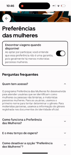Essa modalidade estará disponível somente em Piracicaba.         Desde 2019, com o lançamento da modalidade U-Elas, que permite que motoristas mulheres recebam pedidos de viagens somente de usuárias mulheres. A Uber segue investindo em aumentar sua base de motoristas parceiras — que já cresceu em 160% nos últimos anos e atualmente é de 8% em todo o Brasil, e  avaliando formas de viabilizar essa experiência para as usuárias. O objetivo agora é acompanhar o uso dos diferentes formatos e os feedbacks de motoristas parceiras e usuárias para avaliar os próximos passos para expansão da  ferramenta.        |